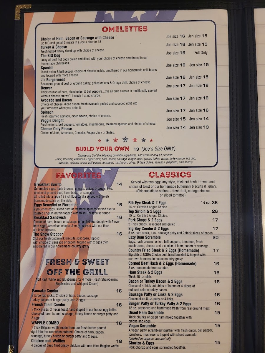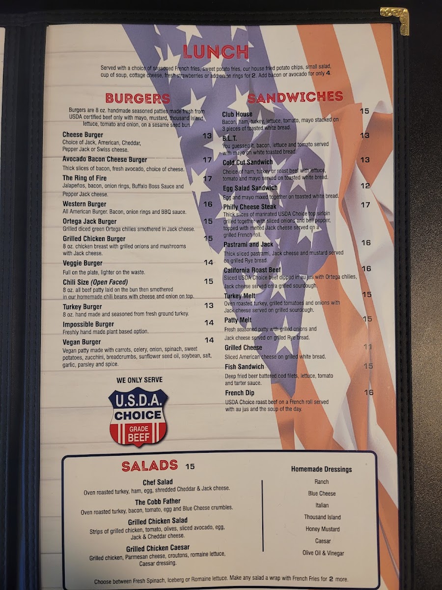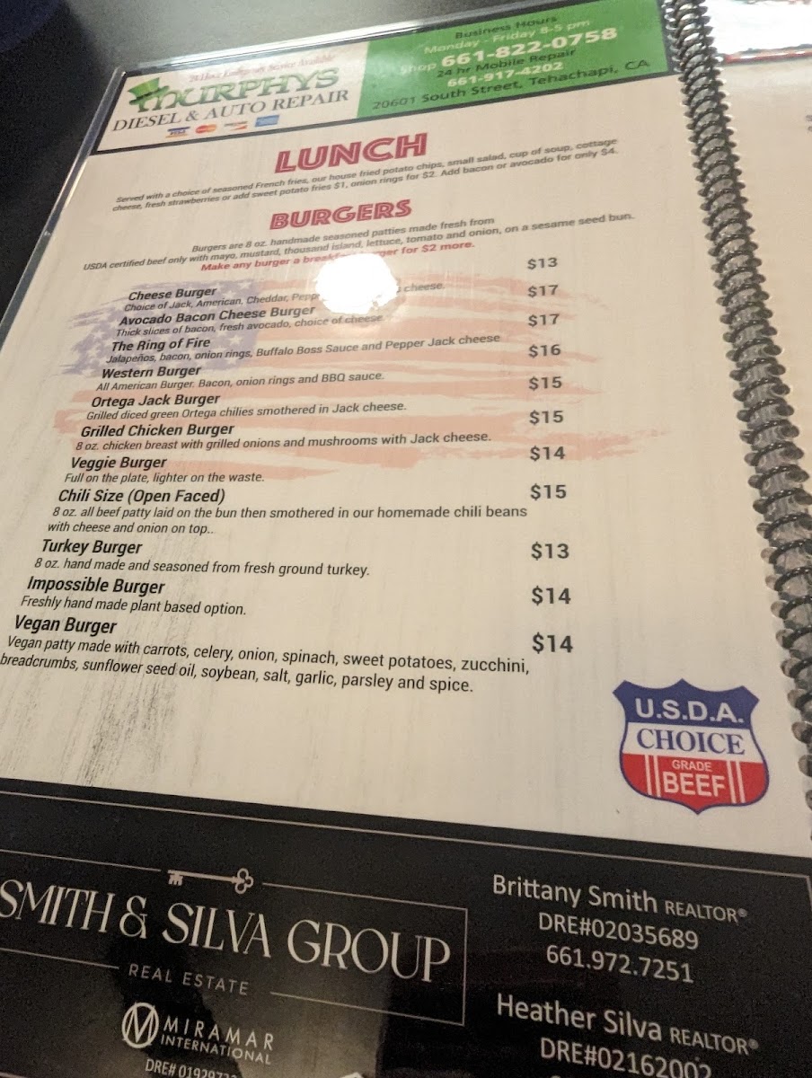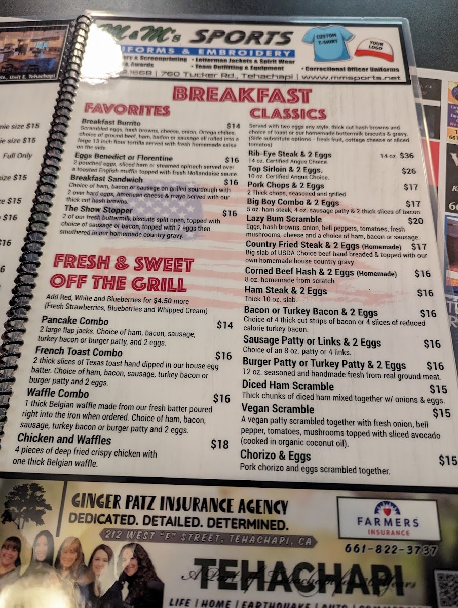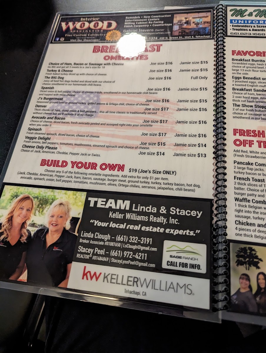 From a reviewer’s perspective, the menu at J's Hideaway Tehachapi, located at 20424 Brian Way, Tehachapi, CA 93561, offers a satisfying and well-rounded selection that clearly focuses on comfort food done right. The burger lineup stands out with classic and hearty options such as the Cheese Burger, Avocado Bacon Cheese Burger, The Ring Of Fire Western Burger, and Turkey Burger, each catering to different tastes while staying true to American grill favorites. The sandwich section is equally diverse, featuring reliable choices like the Club House, B.L.T, Cold Cut Sandwich, Egg Salad Sandwich, and California Roast Beef, making it easy to find something familiar yet filling. For those seeking lighter fare, salads such as the Chef Salad, The Cobb Father, Grilled Chicken Salad, and Grilled Chicken Caesar provide balanced alternatives without sacrificing flavor. Breakfast and grill specialties shine in the “Fresh & Sweet Off The Grill” and favorites categories, with comforting plates like the Pancake Combo, French Toast Combo, Waffle Combo, Chicken And Waffles, Breakfast Burrito, Eggs Benedict Or Florentine, Breakfast Sandwich, and the indulgent The Show Stopper. Rounding out the menu, hearty options like Rib-Eye Steak & 2 Eggs reinforce the restaurant’s focus on generous portions and satisfying meals. Overall, the menu at J’s Hideaway Tehachapi feels thoughtfully curated, blending breakfast classics, robust burgers, and comforting favorites into a cohesive dining experience that leaves a lasting impression.